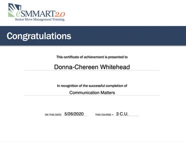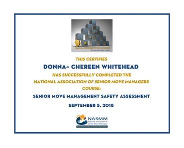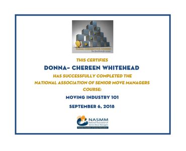 Senior Move Management is the profession that assists older adults and their families with the emotional and physical aspects of relocation and/or “aging in place.” Senior Move Managers® require a profound commitment to connecting with older adults and a desire to perform meaningful work. All general members of the National Association of Senior Move Management must meet strict vetting requirements before approval. These requirements include: